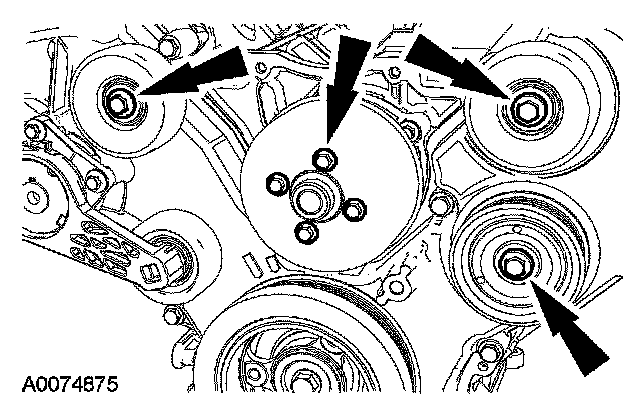 65. Install the 3 accessory drive belt idler pulleys, the coolant pump pulley and the 7 bolts.