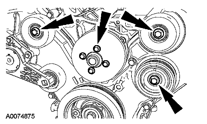31. Remove the bolts, the coolant pump pulley and the 3 accessory drive belt idler pulleys.