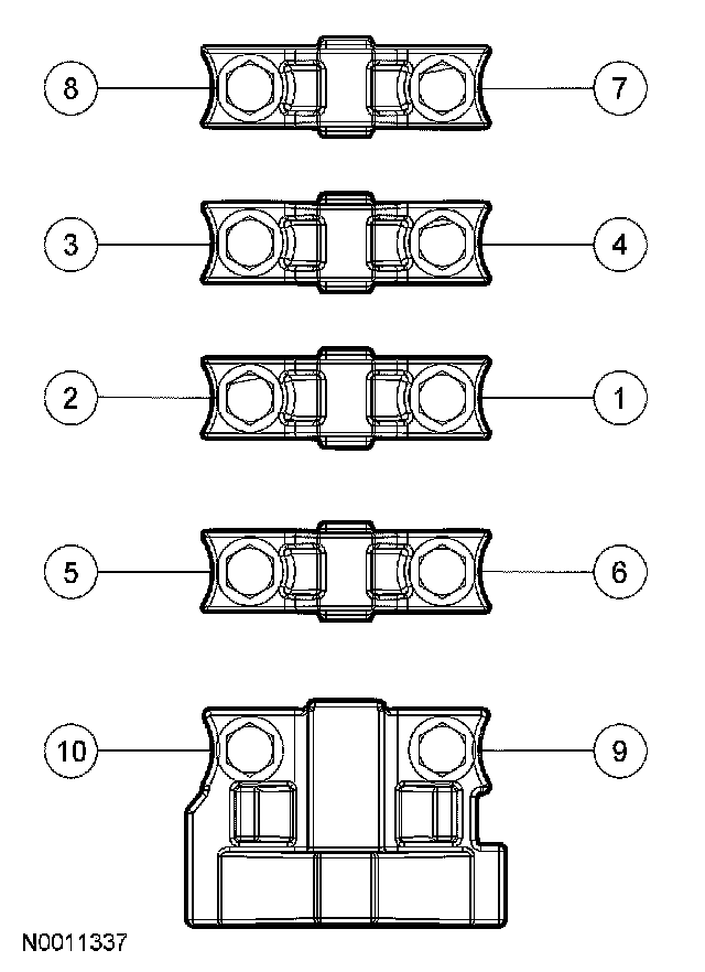 Remove the bolts in the sequence shown and remove the LH cylinder head front camshaft bearing cap and then the remaining bearing caps.