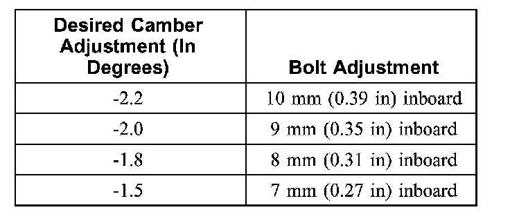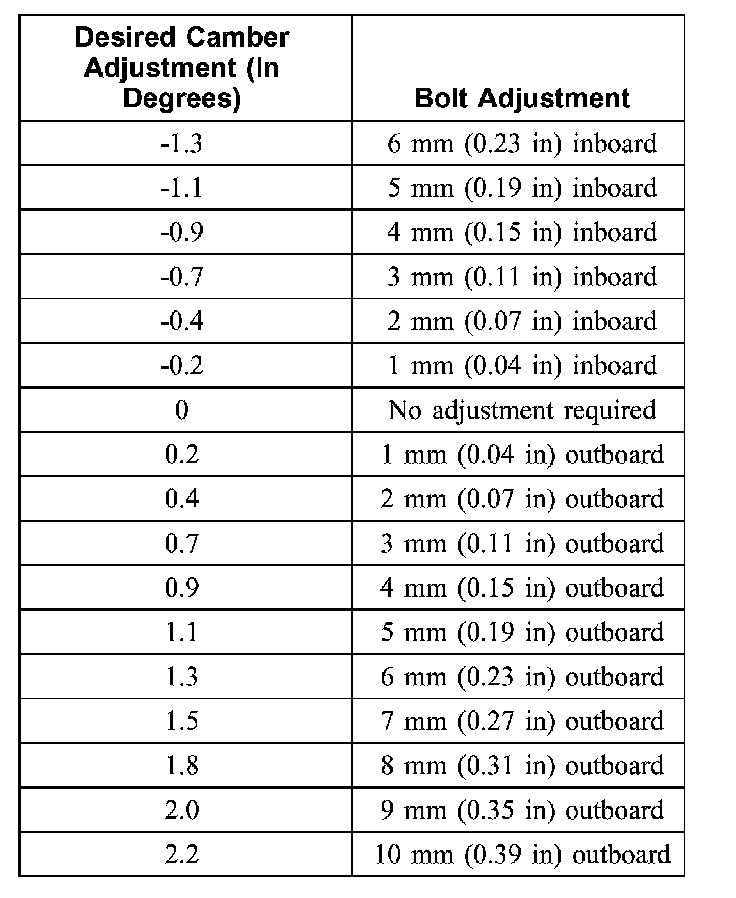 4. Use the following table to determine the camber adjustment required. Obtained by subtracting the specified camber angle from the measure camber angle.