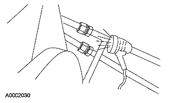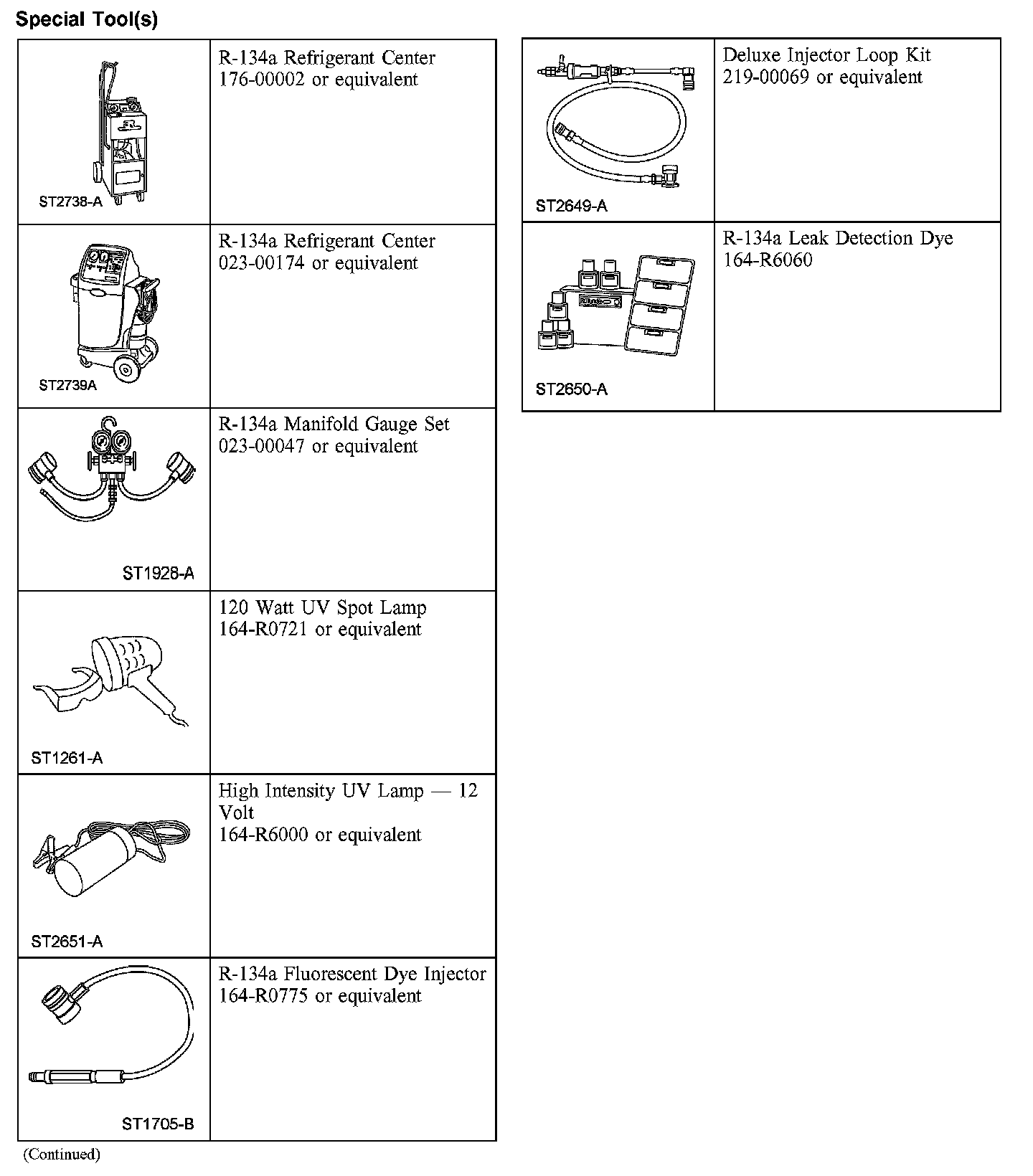 NOTE: Ford Motor Company vehicles are produced with R-134a fluorescent dye installed in the refrigerant system from the factory. The location of leaks can be pinpointed by the bright yellow-green glow of the fluorescent dye under a UV lamp. Since more than one leak can exist, make sure to inspect each component, line and fitting in the refrigerant system for a leak.