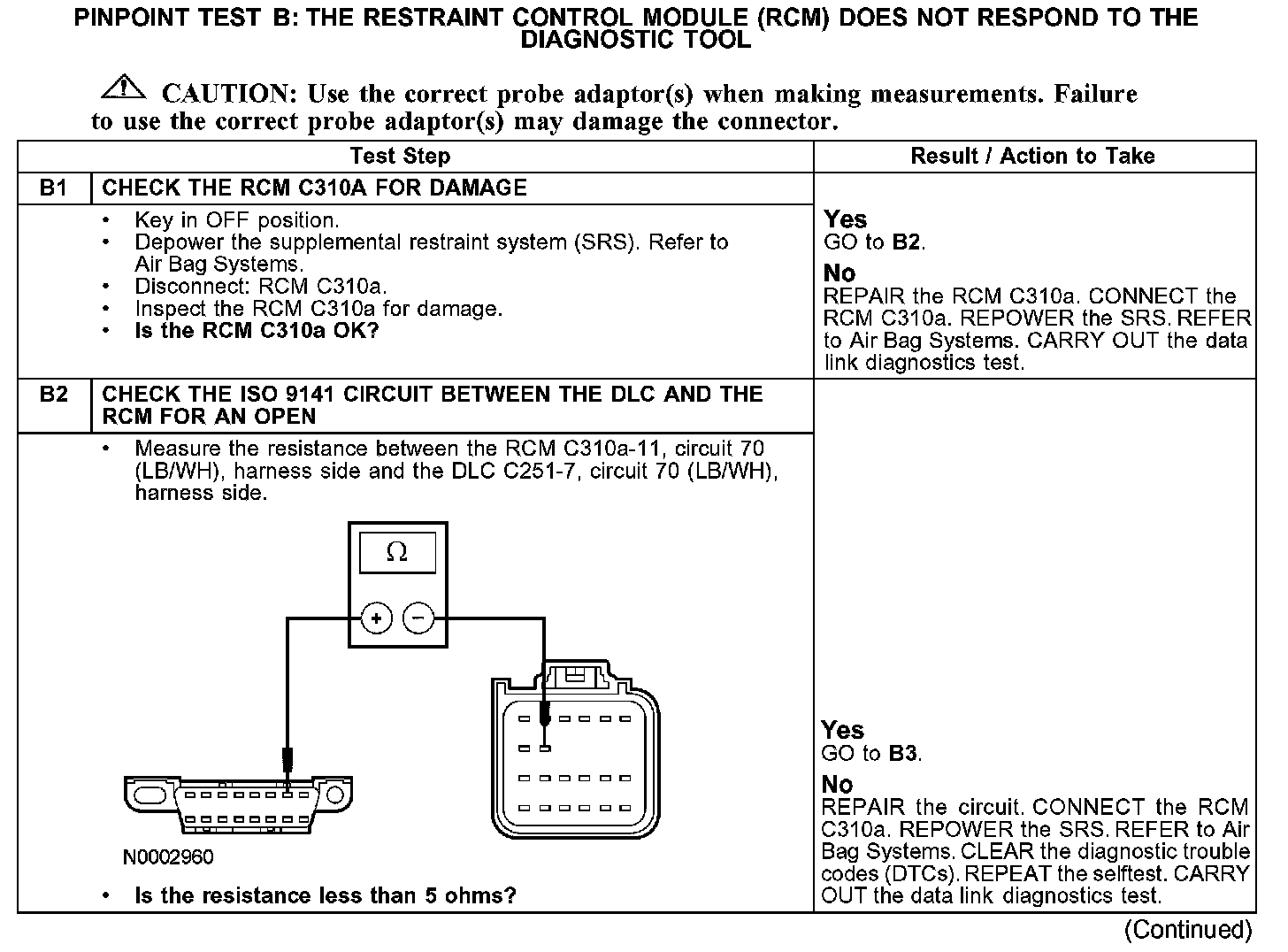 The restraint control module (RCM) communicates with the diagnostic tool through the international standards organization (ISO) 9141 communications network, circuit 70 (LB/WH). Check circuit 70 (LB/WH) between the RCM C310a and the data link connector (DLC) C251. The total resistance value must not be more than 5 ohms. If the resistance is more than 5 ohms there is an open in the ISO 9141 communications network circuit, damage to the DLC C251, damage to the RCM C310a, or a problem in an in-line connector.