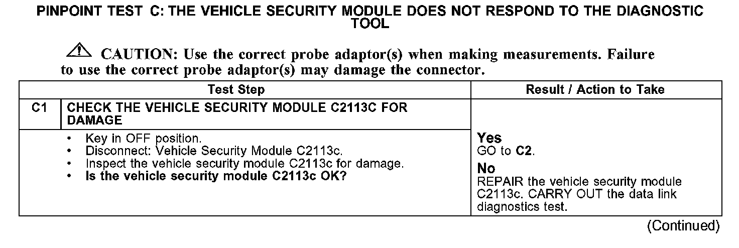 PINPOINT TEST C: THE VEHICLE SECURITY MODULE DOES NOT RESPOND TO THE DIAGNOSTIC TOOLC1: