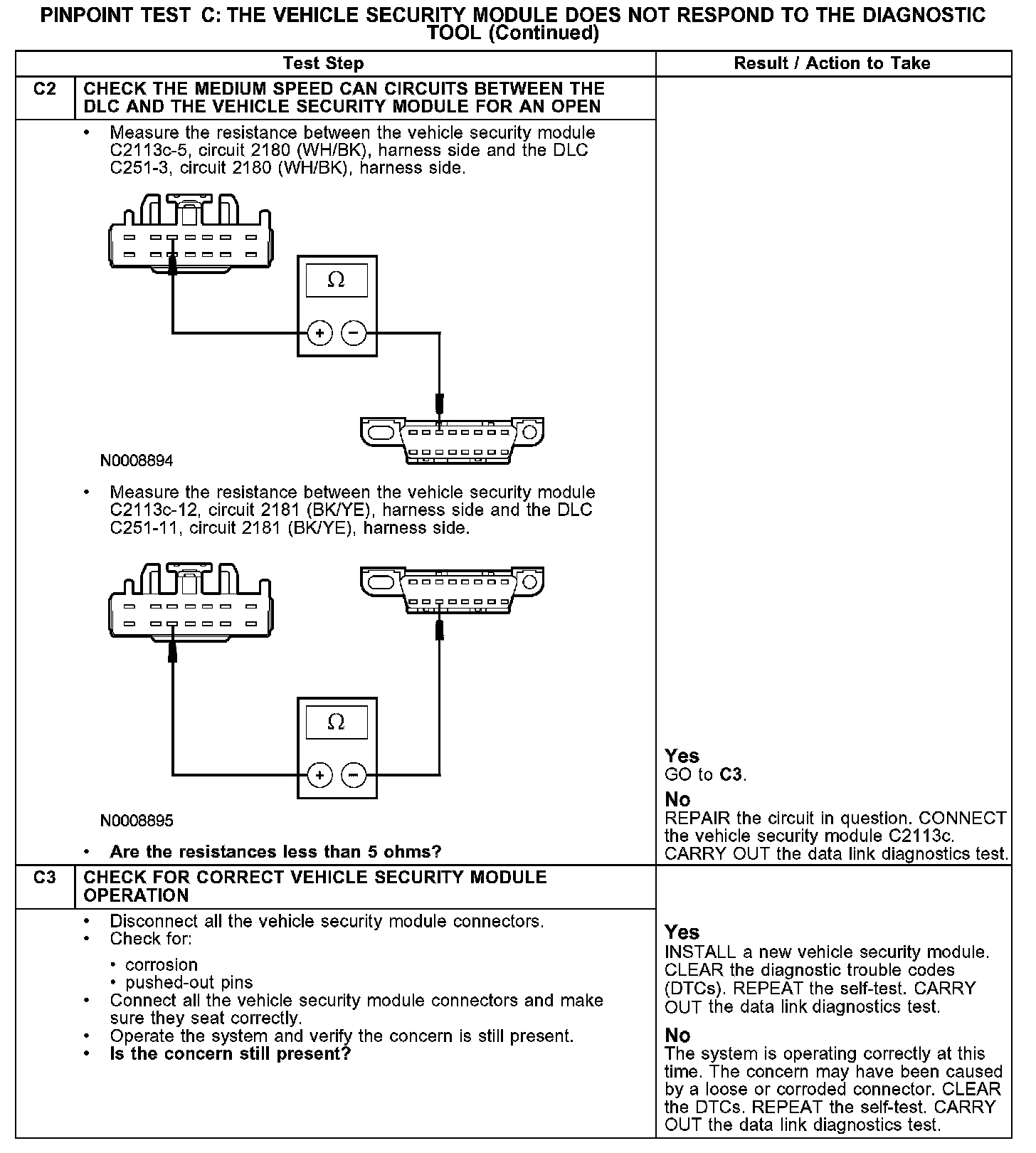 The vehicle security module communicates with the diagnostic tool through the medium speed controller area network (CAN), circuits 2180 (WH/BK) and 2181 (BK/YE). Check circuits 2180 (WH/BK) and 2181 (BK/YE) between the vehicle security module C2113c and the data link connector (DLC) C251. The total resistance values must not be more than 5 ohms. If the resistance is more than 5 ohms there is an open in one of the medium speed CAN circuits, damage to the DLC C251, damage to the vehicle security module C2113c, or a problem in an in-line connector.