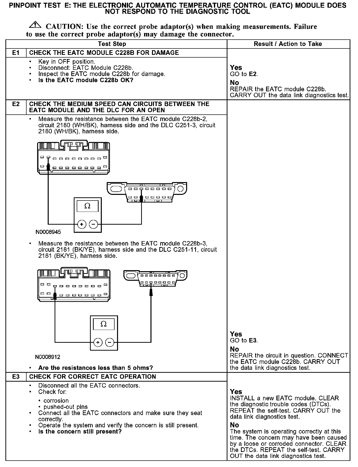 The EATC module communicates with the diagnostic tool through the medium speed controller area network (CAN), circuits 2180 (WH/BK) and 2181 (BK/YE). Check circuits 2180 (WH/BK) and 2181 (BK/YE) between the EATC C228b and the data link connector (DLC) C251. The total resistance values must not be more than 5 ohms. If the resistance is more than 5 ohms there is an open in one of the medium speed CAN circuits, damage to the DLC C251, damage to the EATC C228b, or a problem in an in-line connector.