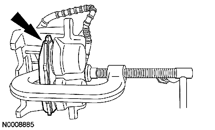 CAUTION: Do not allow the brake caliper to hang from the brake hose or damage to the hose can occur.