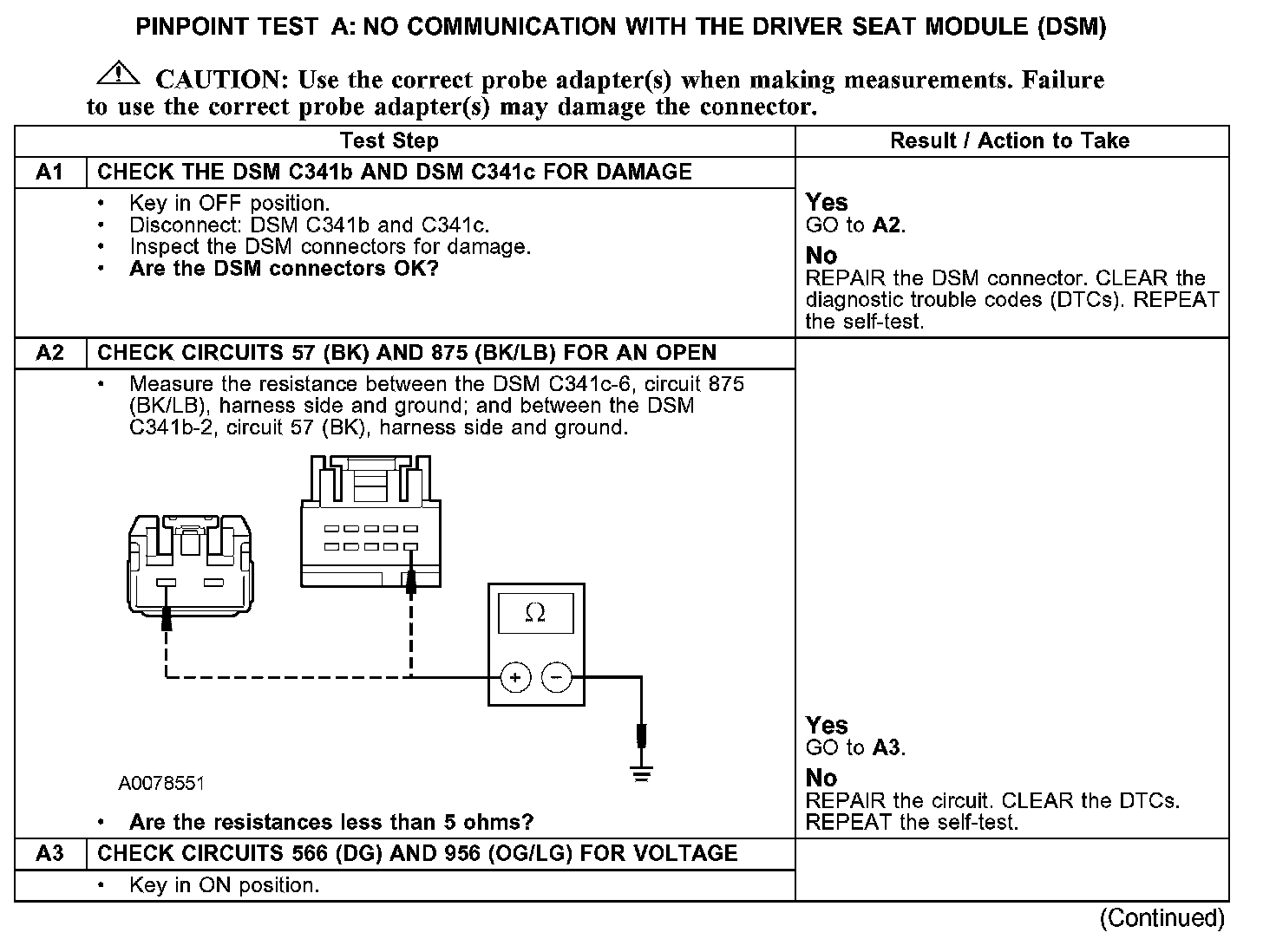 PINPOINT TEST A: NO COMMUNICATION WITH THE DRIVER SEAT MODULE (DSM)A1-A3: