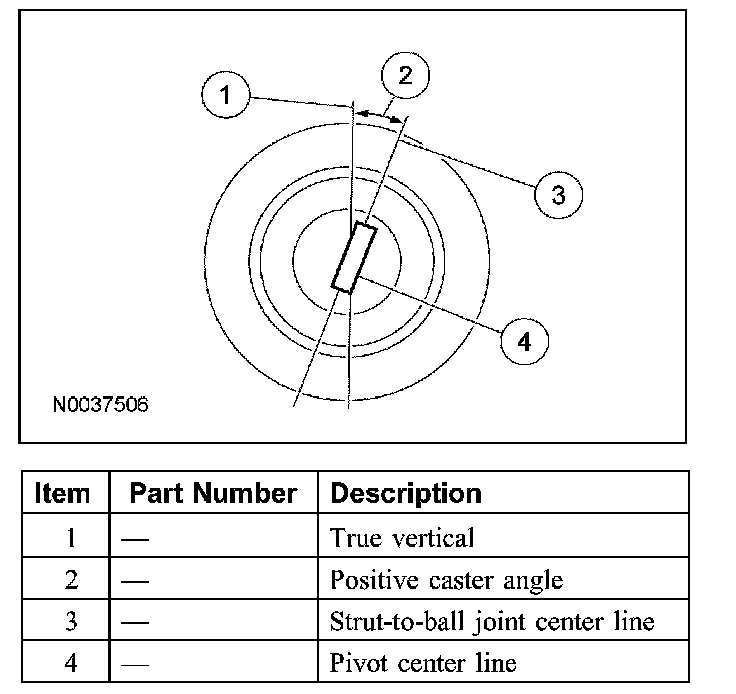 Caster is deviation from vertical of an imaginary line drawn through the ball joints when viewed from the side. The caster specifications will give the vehicle the best directional stability characteristics when loaded and driven. The caster setting is not related to tire wear.
