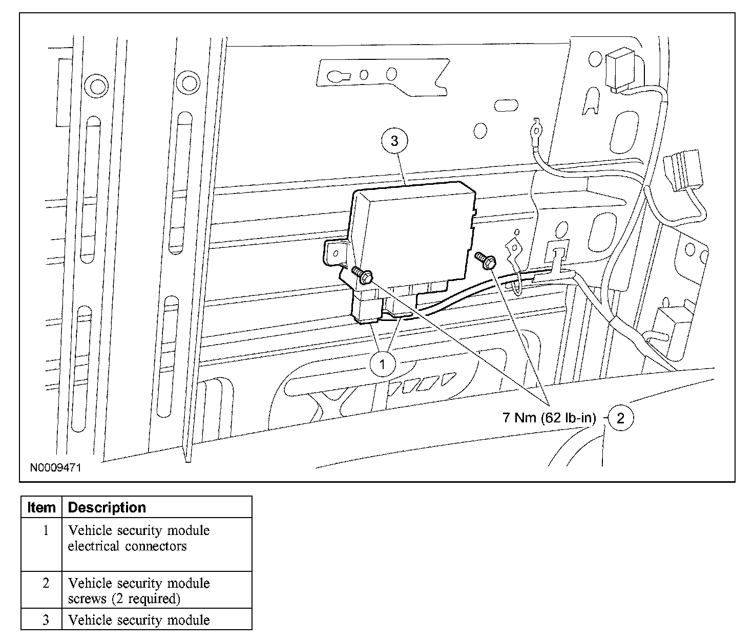 CAUTION: Prior to the removal of the vehicle security module, it is necessary to upload the module configuration information to the diagnostic tool. This information needs to be downloaded into the new module once installed.