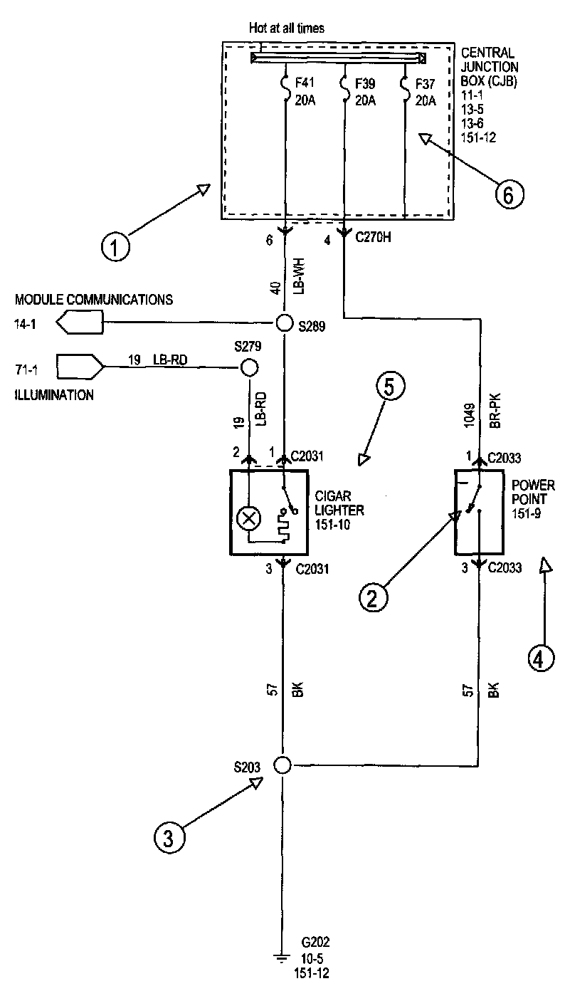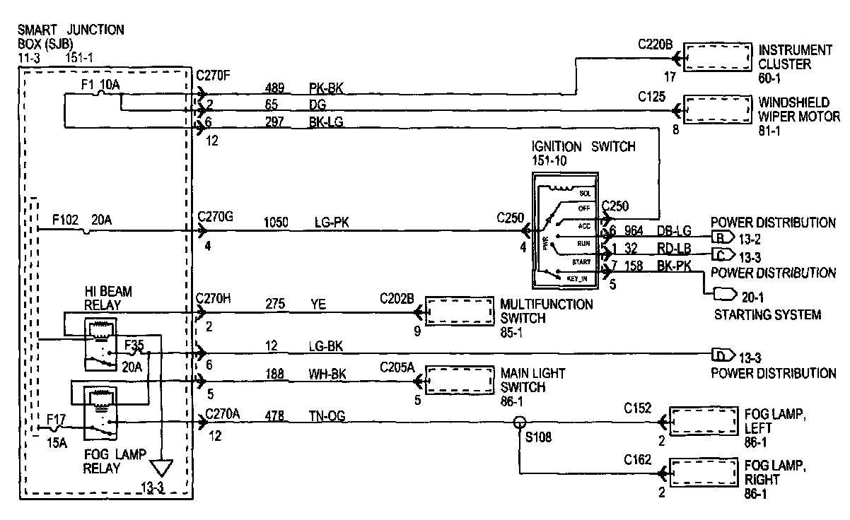 Each set of diagrams normally starts with the component that powers the circuit such as a fuse or the ignition switch. Current flow is shown from the power source at the top of the diagram to ground at the bottom of the diagram. A full representation of the power supply of a fuse or the power distribution from a fuse to various components is given in Power and Ground Distribution Diagrams. Full representation of the ground connections are shown in Power and Ground Distribution Diagrams.