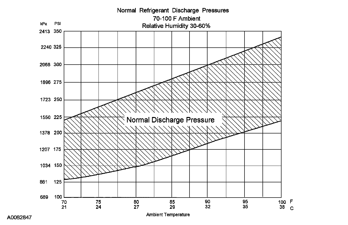 8. Determine if the discharge pressure falls within the normal operating limits using the Normal Refrigerant Discharge Pressures chart.