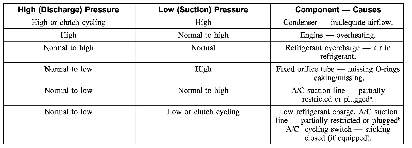 NOTE:The table is used to guide diagnosis of the refrigerant system if operating pressures are outside normal limits.