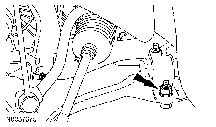 5. CAUTION: Tighten the lower arm outboard bracket nut and bolt with the suspension at curb height.