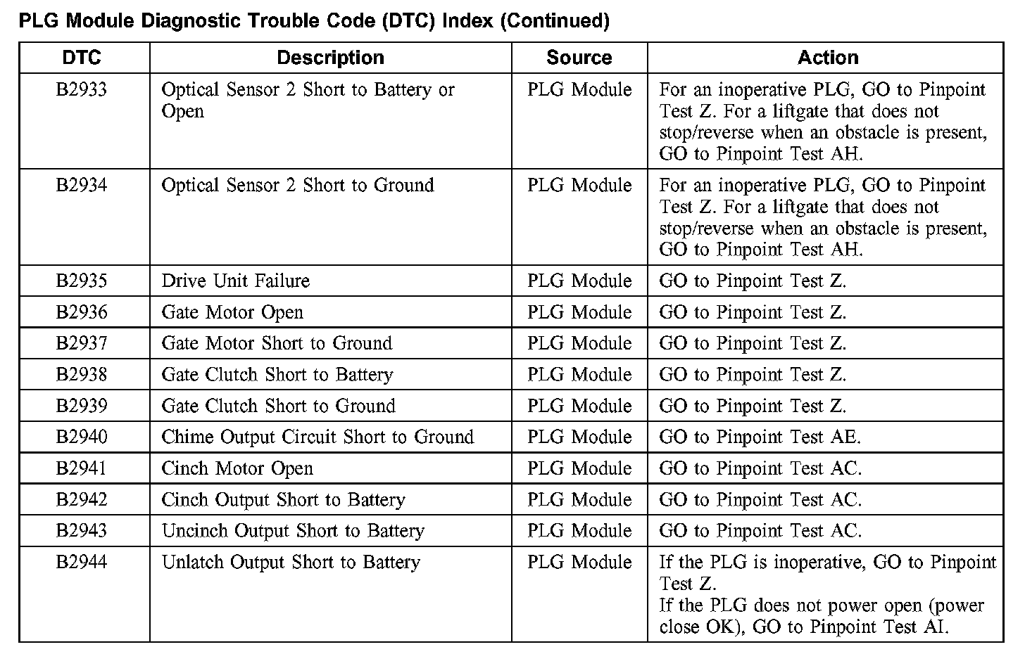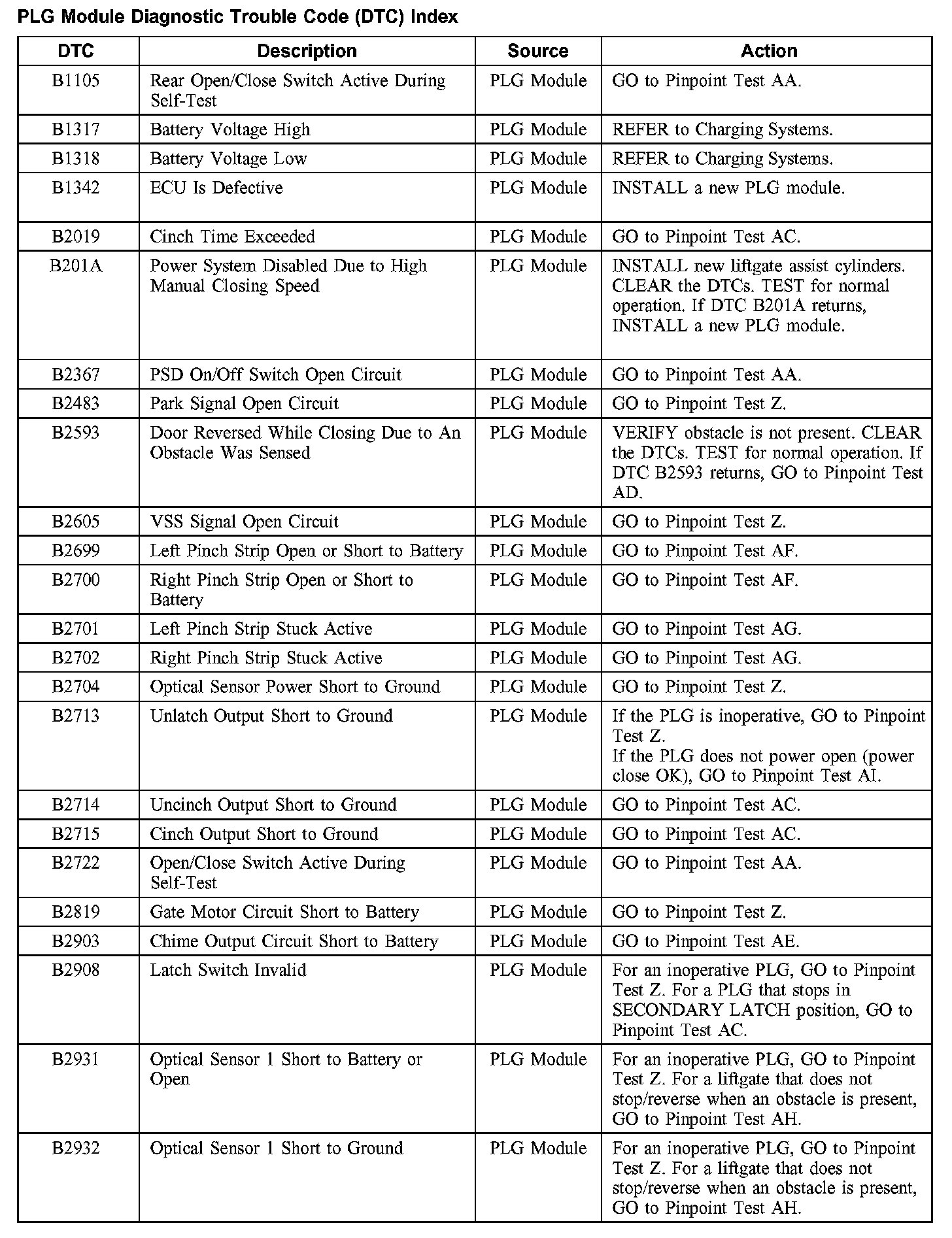 PLG Module Diagnostic Trouble Code DTC Index