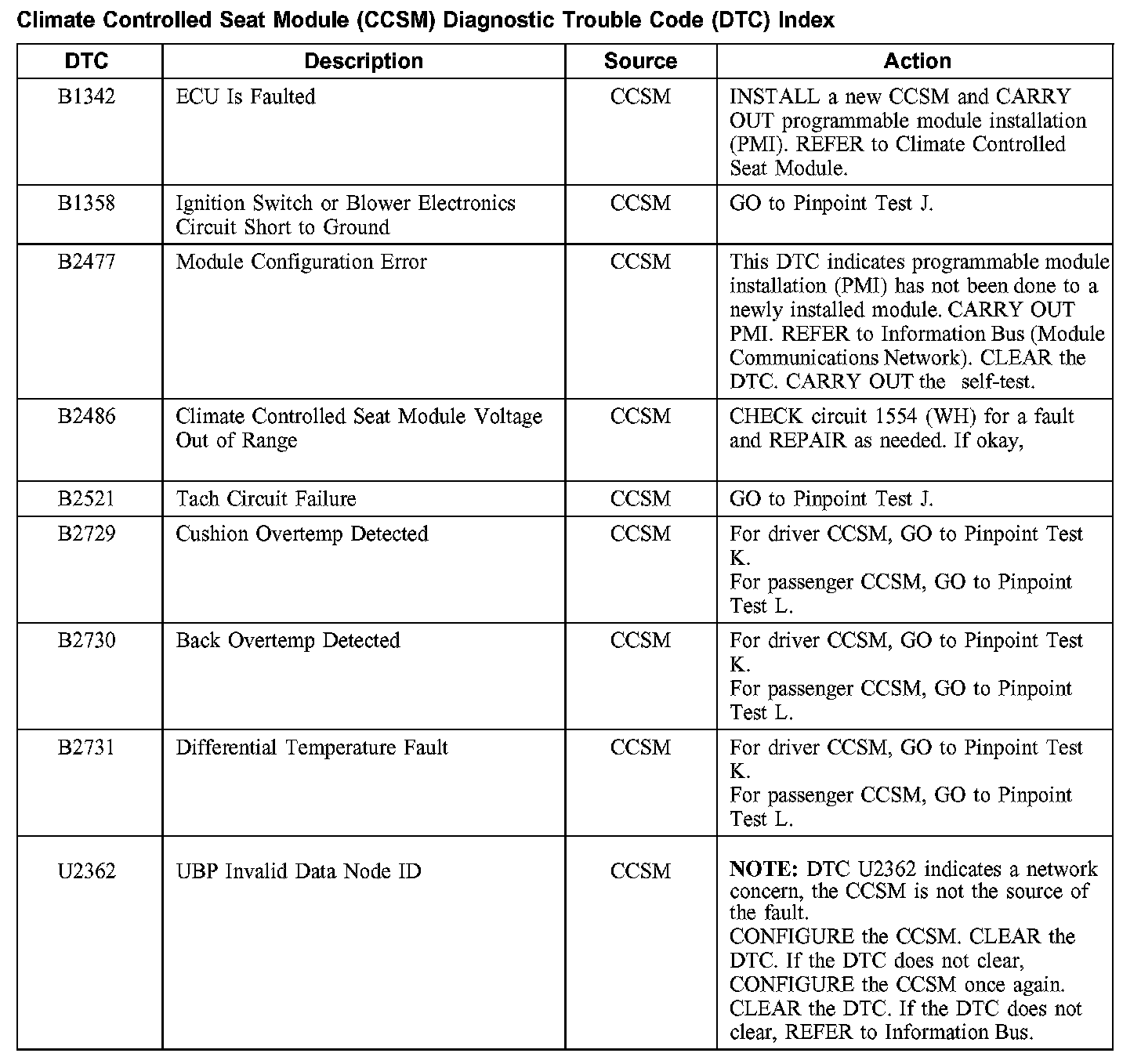 Climate Controlled Seat Module (CCSM) Diagnostic Trouble Code (DTC) Index