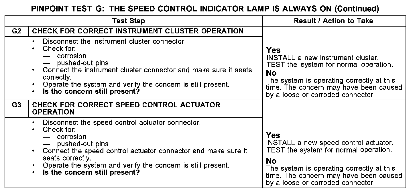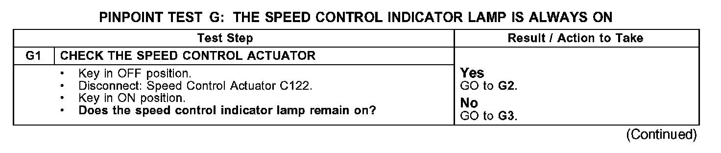 PINPOINT TEST G: THE SPEED CONTROL INDICATOR LAMP IS ALWAYS ONG1: