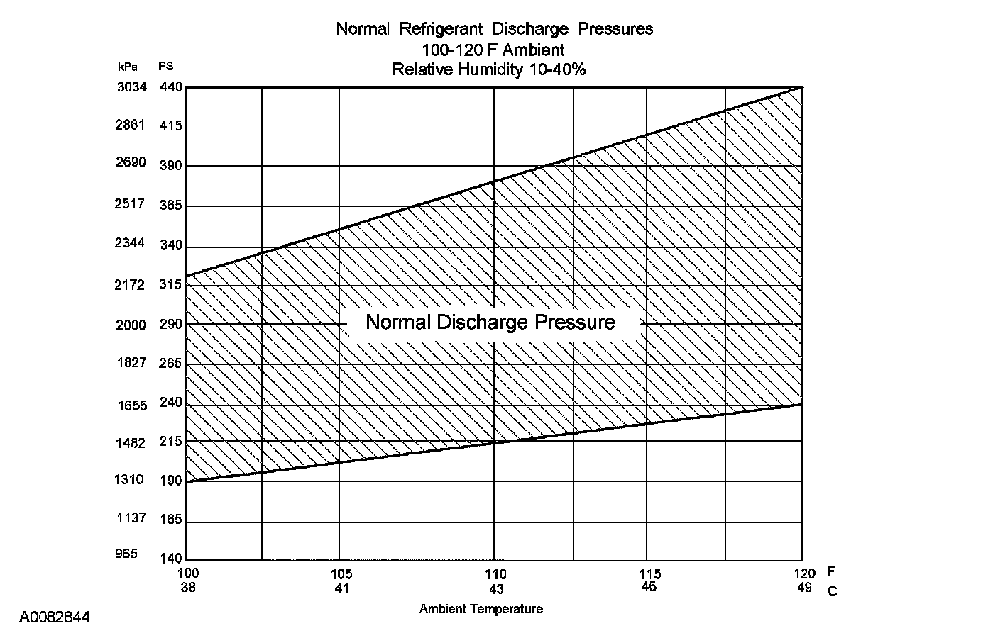 8. Determine if the discharge pressure falls within the normal operating limits using the Normal Refrigerant Discharge Pressures chart.