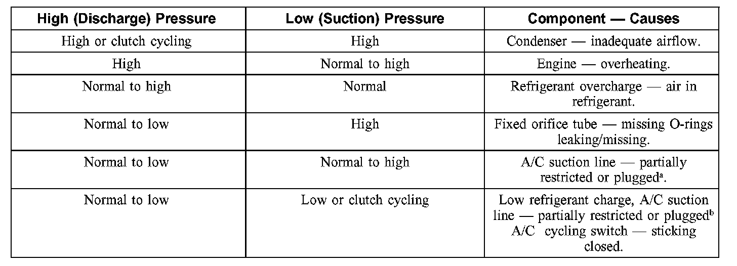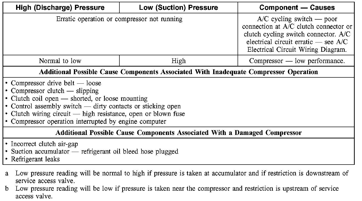 1. NOTE: The table is used to guide diagnosis of the refrigerant system if operating pressures are outside normal limits.