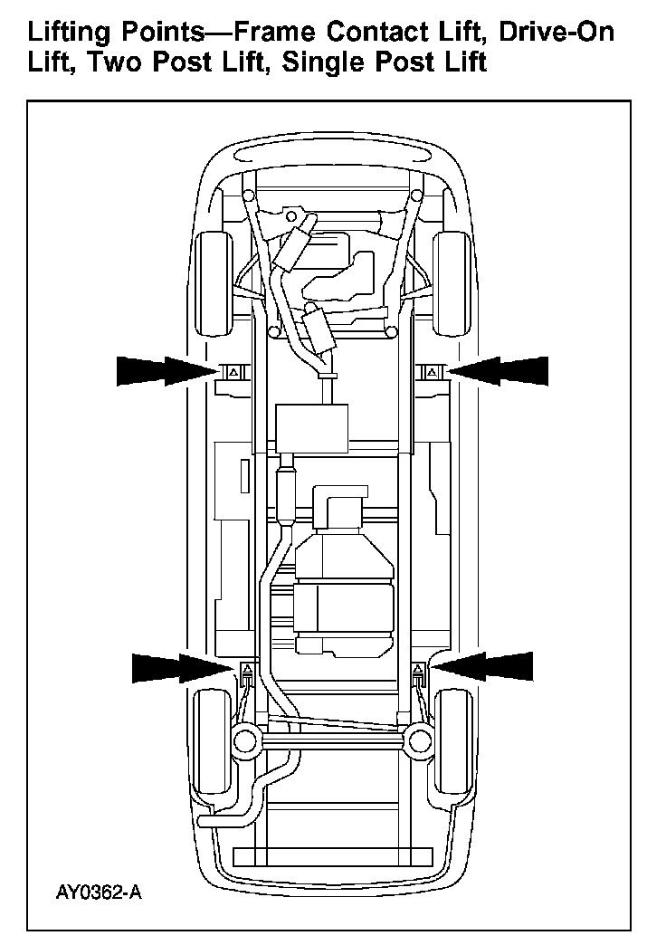 WARNING: All four hoist contact points must contact the designated vehicle lifting locations, identified by a triangle stamped in the unibody sheet metal. Using other areas to lift the vehicle may cause damage to the vehicle or personal injury. Failure to follow these instructions may result in personal injury.