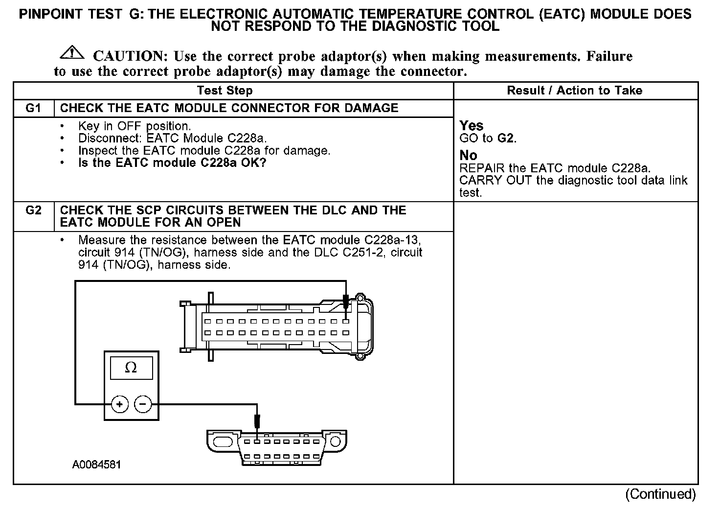 The EATC module communicates with the diagnostic tool through the standard corporate protocol (SCP) communication network, circuits 914 (TN/OG) and 915 (PK/LB). Check circuits 914 (TN/OG) and 915 (PK/LB) between the EATC module C228a and the data link connector (DLC) C251. The total resistance values must not be more than 5 ohms. If the resistance is more than 5 ohms, there is an open in the SCP network circuits, damage to the DLC C251, the EATC module C228a, or a problem in the in-line connectors.