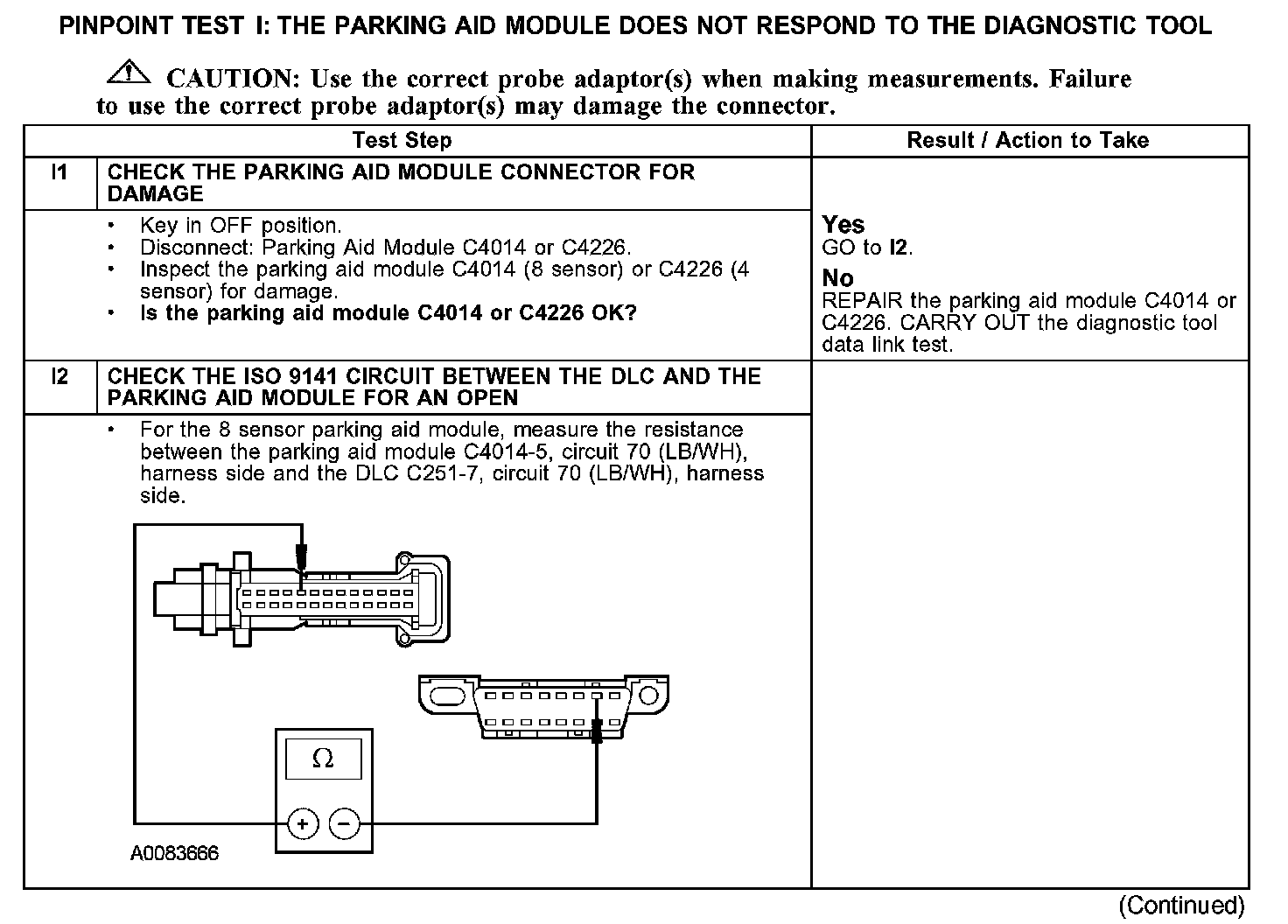 Two versions of this system are available, reverse parking aid with 4 sensors (rear only), and parking aid with 8 sensors (4 additional front sensors). Both types of parking aid module communicate with the diagnostic tool through the international standards organization (ISO) 9141 communication network, circuit 70 (LB/WH). Check circuit 70 (LB/WH) between the parking aid module C4014 (8 sensor) or C4226 (4 sensor), and the data link connector (DLC) C251. The total resistance value must not be more than 5 ohms. If the resistance is more than 5 ohms, there is an open in circuit 70 (LB/WH), damage to the DLC C251, damage to the parking aid module connector, or a problem in the in-line connectors.