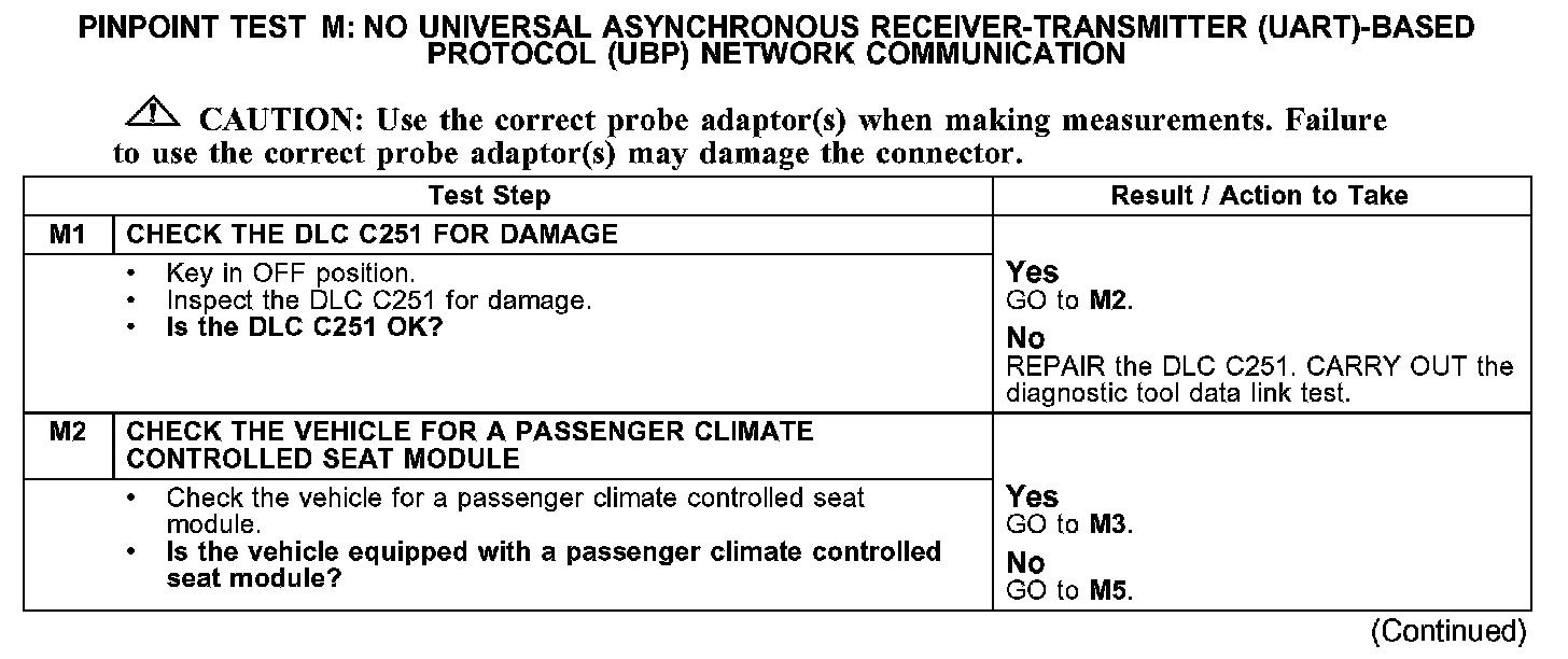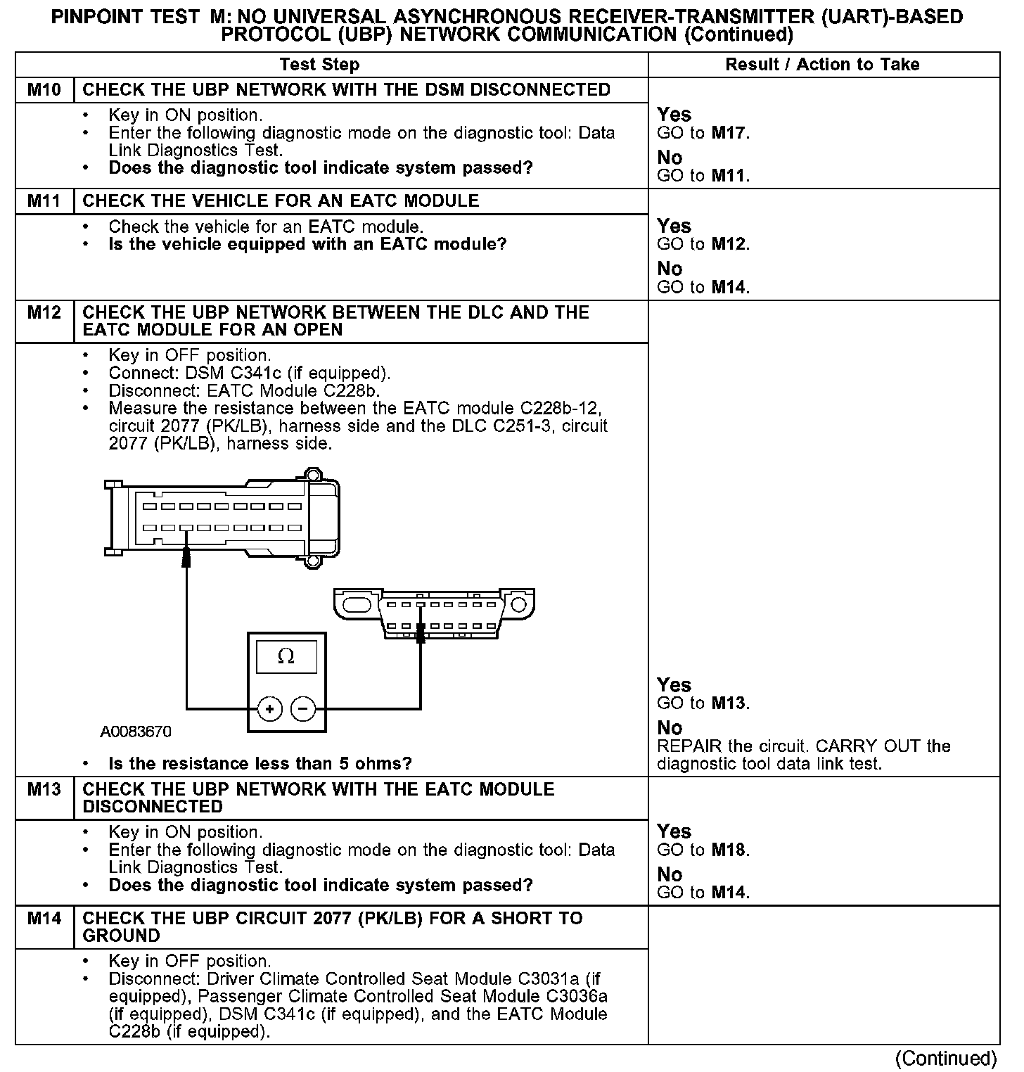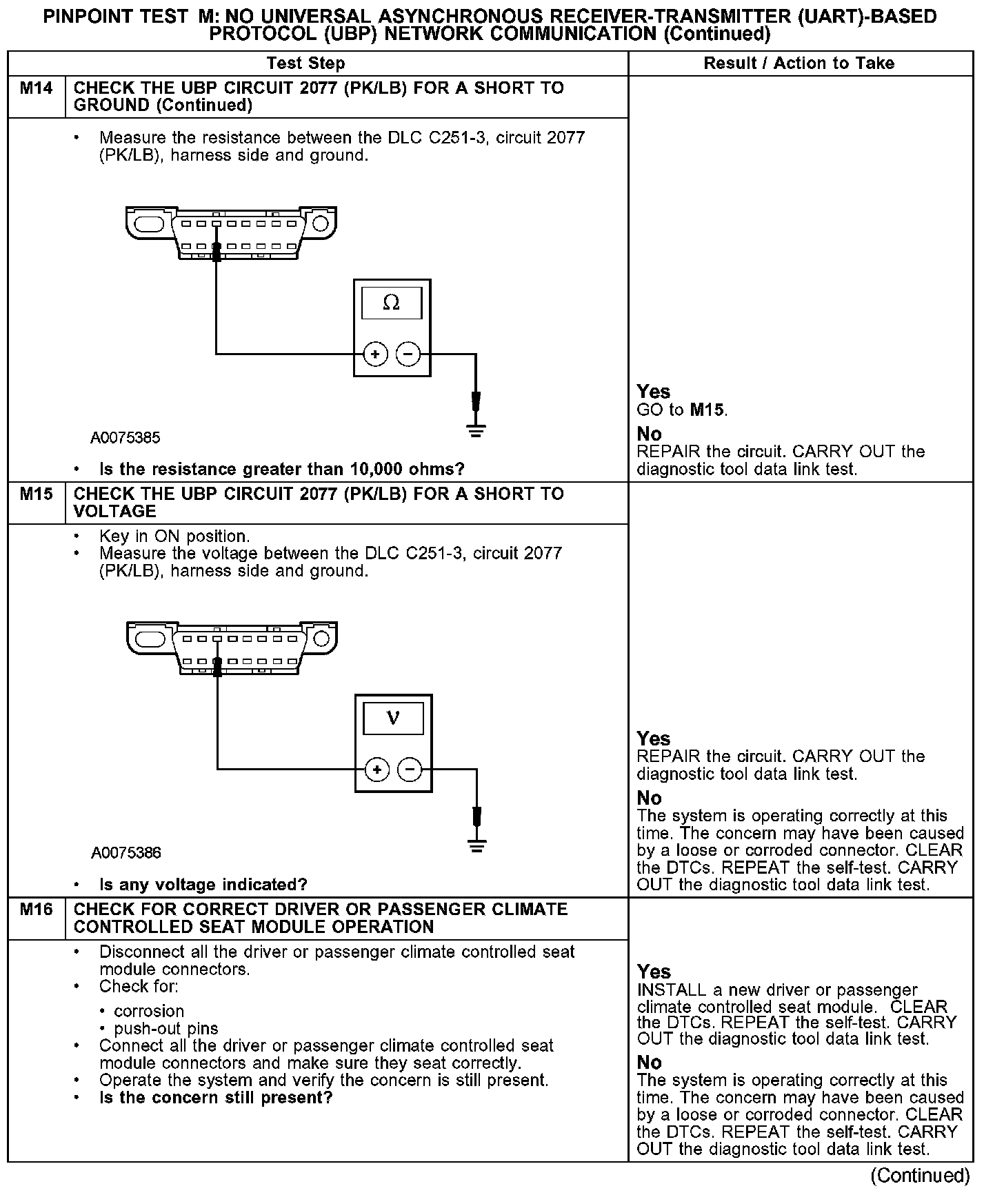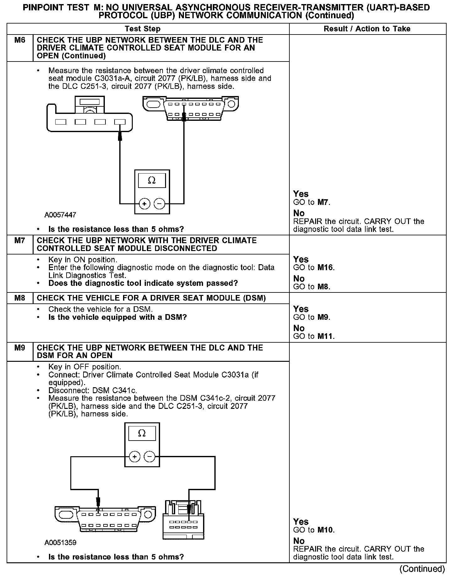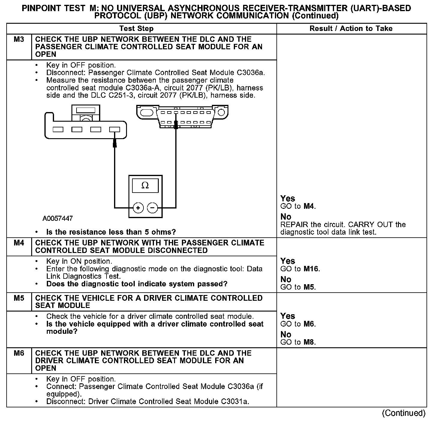 The driver climate control seat module, passenger climate control seat module, electronic automatic temperature control (EATC) module, and the driver seat module (DSM) communicate with the diagnostic tool through the UBP communications network, circuit 2077 (PK/LB). If the UBP circuit is open, communication to the module in question is not possible. If the circuit is shorted to ground or shorted to voltage, the entire network goes down and communication to all modules is not possible. Check circuit 2077 (PK/LB) between the driver climate control seat module, passenger climate control seat module, EATC module, DSM and the data link connector (DLC) C251. The total resistance value must not be more than 5 ohms. If the resistance is more than 5 ohms, there is either an open in circuit 2077 (PK/LB), damage to the DLC C251, damage to one of the networked modules, or a problem in one of the in-line connectors. If, after individual checks of each circuit leading to a module show resistance values less than 5 ohms, and no in-line connector issues are present, the data link diagnostics test must be run with the module in question disconnected. If the data link diagnostics test passes with the module in question disconnected, it is the source of the concern and should be removed and a new module installed.