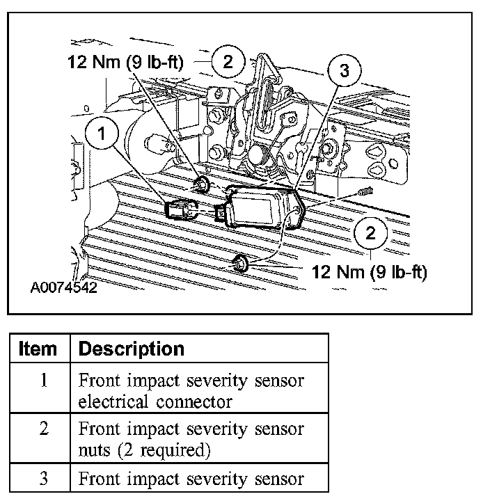 5. WARNING: The tightening torque of the air bag front impact severity sensor retaining nuts is critical for correct system operation.