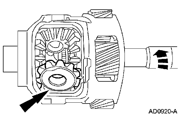 6. Rotate the output shaft and remove the differential pinion gear, and the differential pinion thrust washers.