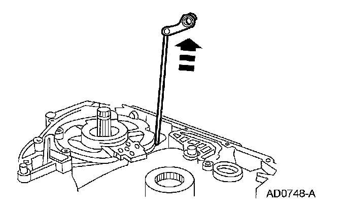 NOTE: The position of the manual valve detent lever is different than past models. The roll pin and shoulder point toward the driven sprocket support. Note the position of the lever during disassembly for correct assembly.