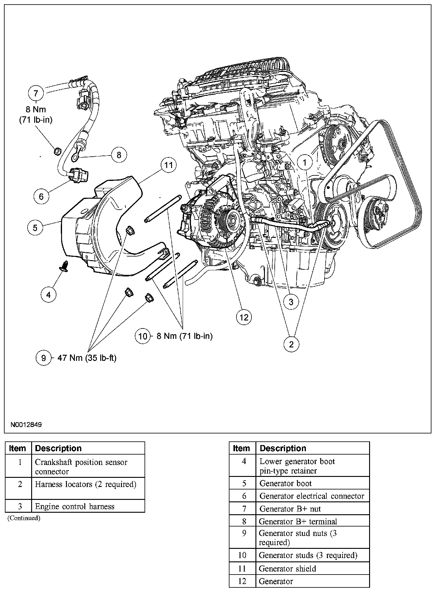 - To install, tighten the new generator bolts or generator nuts to 47 Nm (35 lb-ft).