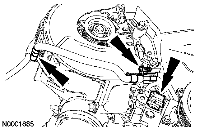 5. Disconnect the crankshaft position sensor and release the 2 wiring harness locators from the generator splash shield.