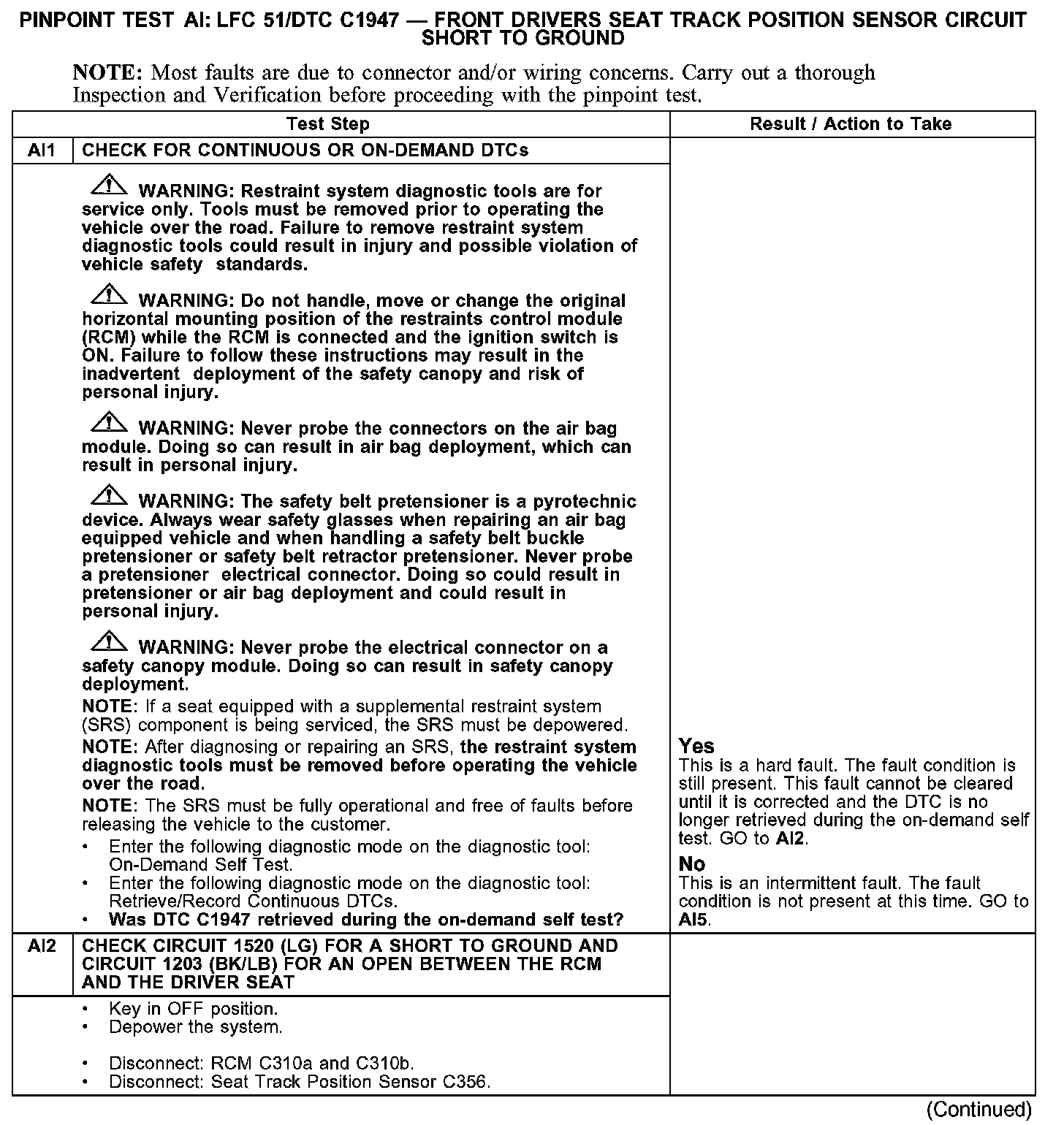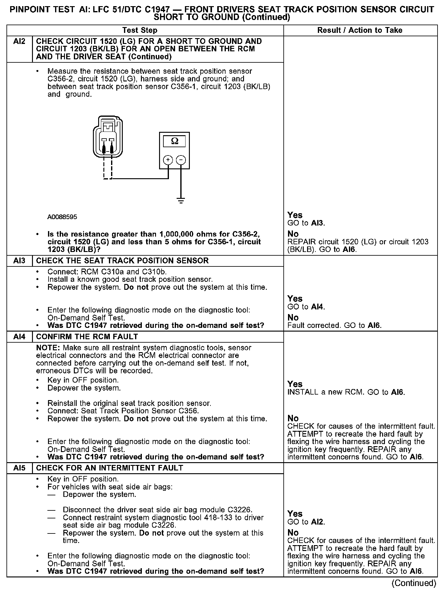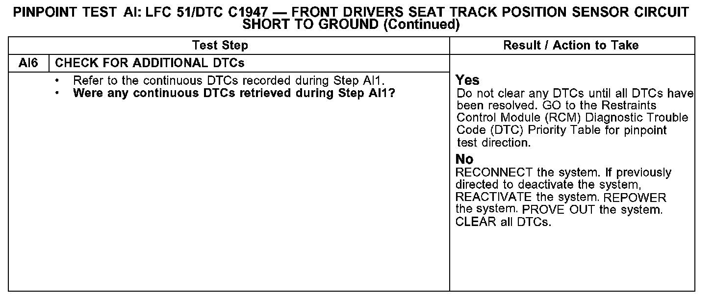 PINPOINT TEST AI: LFC 51/DTC C1947 - FRONT DRIVERS SEAT TRACK POSITION SENSOR CIRCUIT SHORT TO GROUNDAI1-AI2: