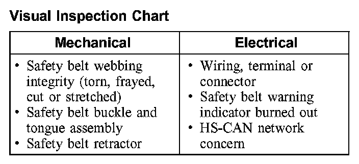 3. If the inspection reveals an obvious concern(s) that can be readily identified, service as required. With the exception of removing a twist from the safety belt webbing, do not attempt to repair a component of the safety belt system; new components must be installed.
