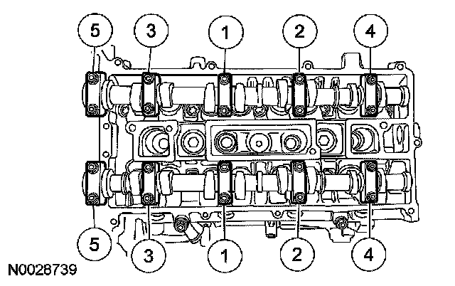 ^ Stage 1: Tighten the camshaft bearing cap bolts one at a time until finger tight.