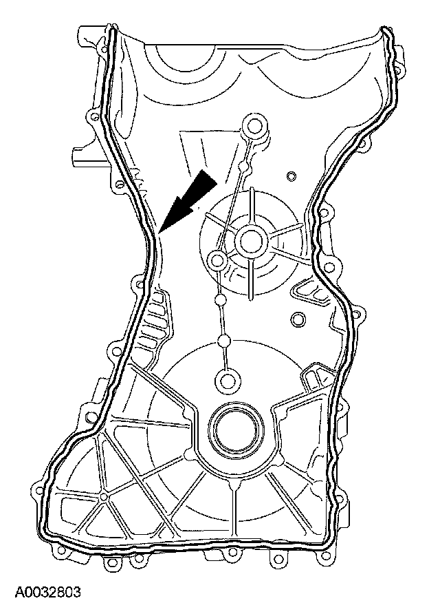 Apply a 2.5 mm (0.09 inch) bead of silicone gasket and sealant to the cylinder head and oil pan joint areas. Apply a 2.5 mm (0.09 inch) bead of silicone gasket and sealant to the front cover.