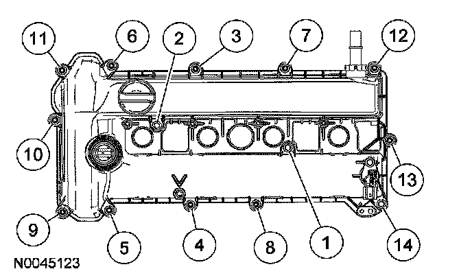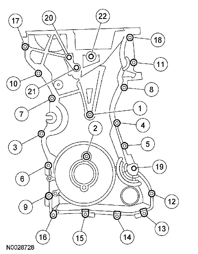65. Install the engine front cover. Tighten the bolts in the sequence shown, to the following specifications:
