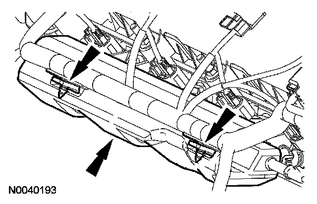 93. Install the fuel supply rail insulator and attach the 2 pin-type harness retainers.