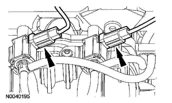 108. Attach the 2 wiring harness pin-type retainers to the intake manifold.