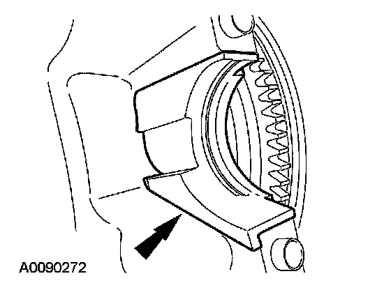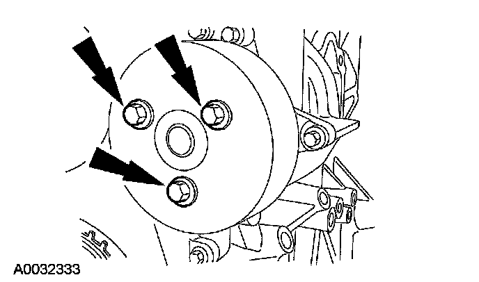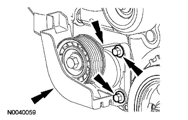 CAUTION: Do not loosen or remove the crankshaft pulley bolt without first installing the special tools as instructed in this procedure. The crankshaft pulley and the crankshaft timing sprocket are not keyed to the crankshaft. The crankshaft, the crankshaft sprocket and the pulley are fitted together by friction, using diamond washers between the flange faces on each part. For that reason, the crankshaft sprocket is also unfastened if you loosen the pulley bolt. Before any repair requiring loosening or removal of the crankshaft pulley bolt, the crankshaft and camshafts must be locked in place by the special service tools, otherwise severe engine damage can occur.