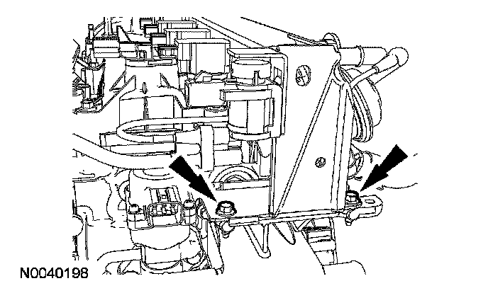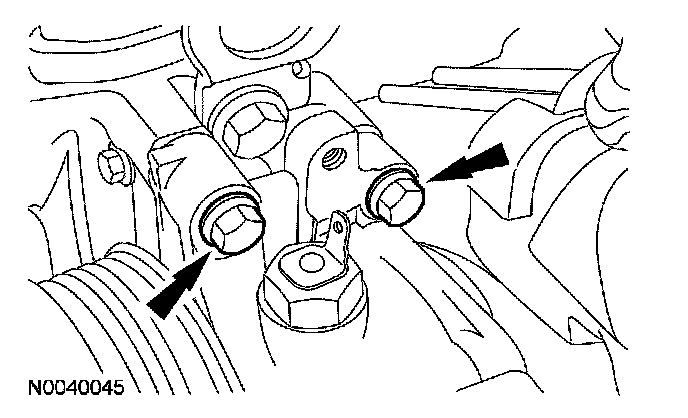 9. On late build engines, remove the 2 bolts and the tensioner.