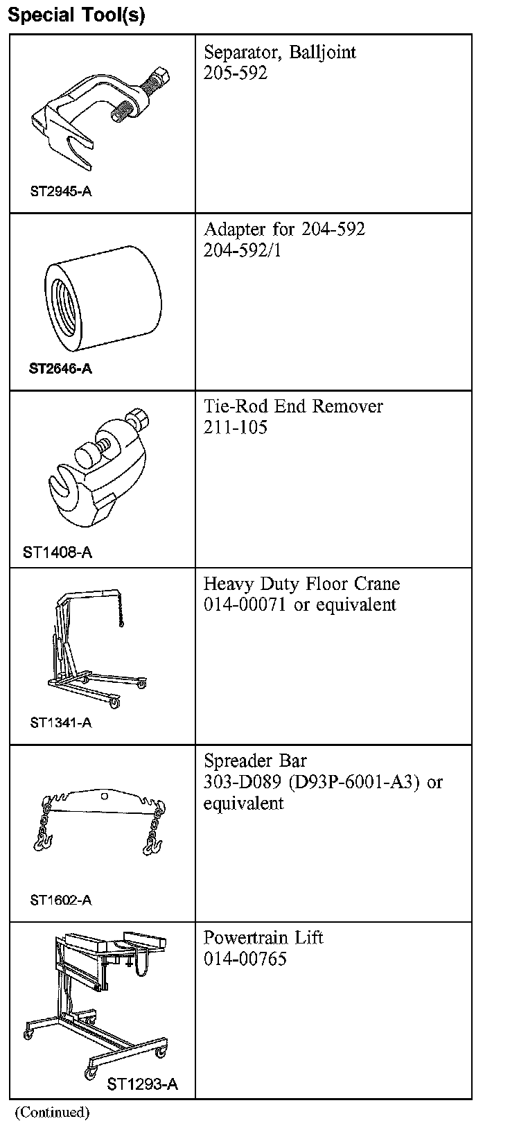 1. With the vehicle in NEUTRAL, position it on a hoist. For additional information, refer to Maintenance/Service and Repair.