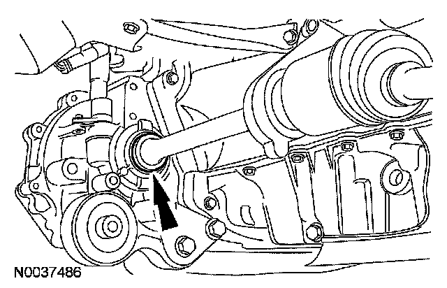 56. Using a suitable tool, separate the LH halfshaft from the transaxle and support the halfshaft with a length of mechanic's wire.
