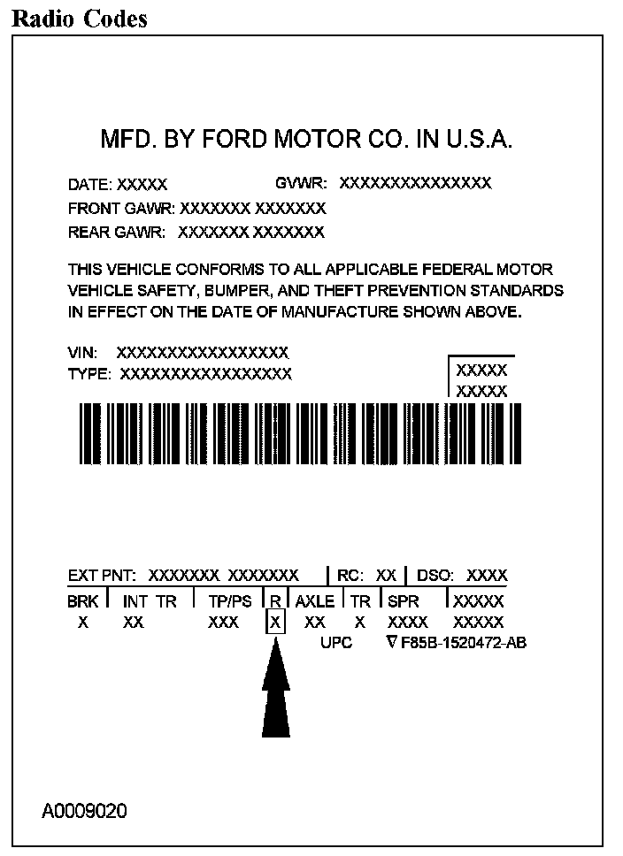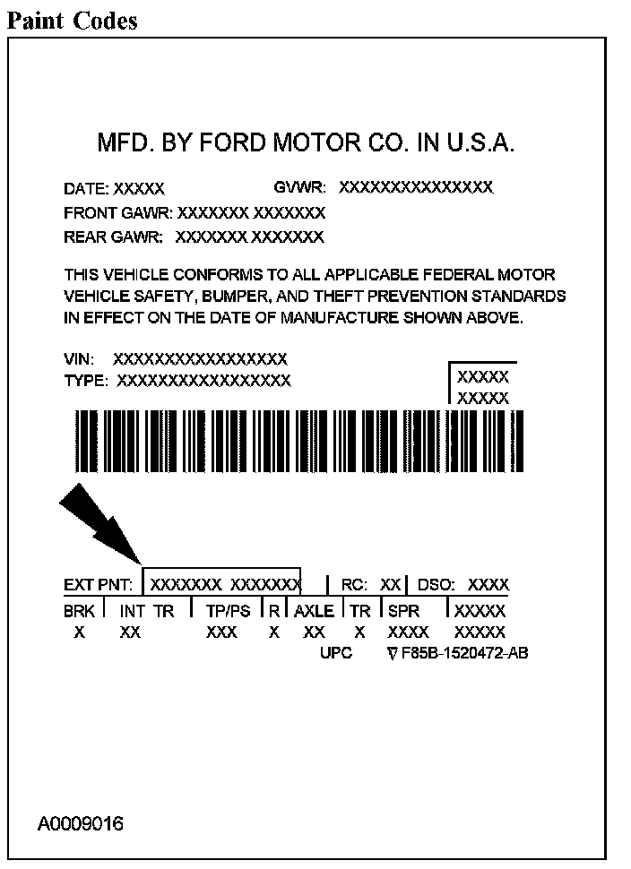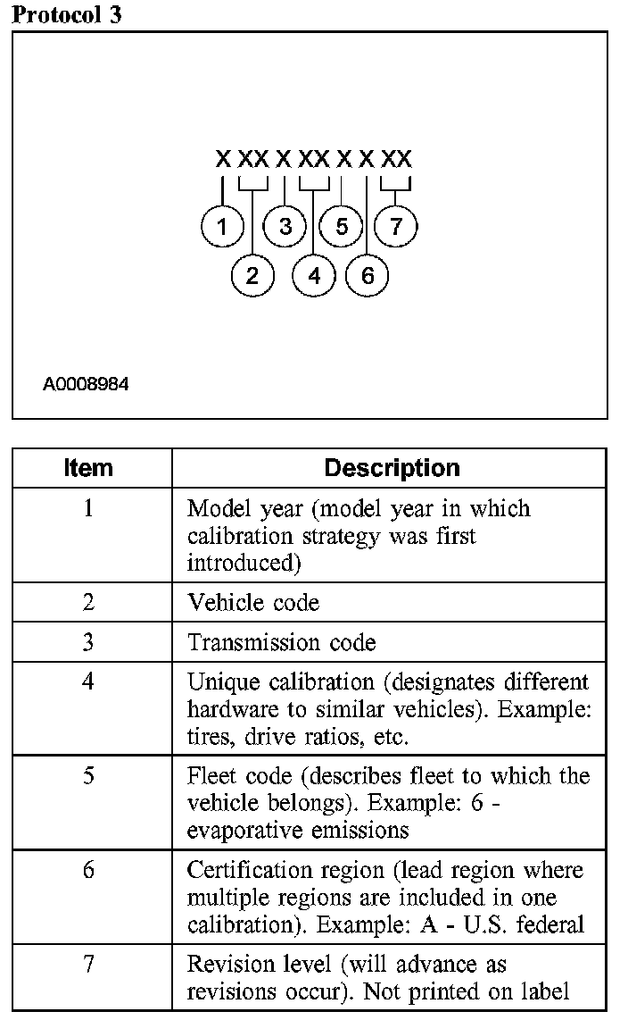 Powertrain calibration information is printed in the lower right corner of the Vehicle Certification Label. Only the base calibration information is printed. Revision levels will not appear, however, this information can be found in the On Line Automotive Service Information System (OASIS). For the current model year, Ford Motor Company is using 3 different protocols which describe powertrain base calibration. These protocols are designed to provide worldwide standardization for vehicle calibration. If the electronic calibration strategy has been used since 1998 and carried into the current model year, protocol 1 will be used. Refer to Protocol 1 below. If the electronic calibration strategy has been used since 1999 and is carried into the current model year, protocol 2 will be used. Refer to Protocol 2 below. For new electronic calibration strategies introduced since the 2000 model year, use protocol 3. Refer to Protocol 3 below.
