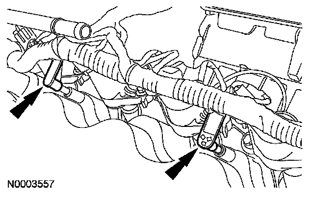 14. Disconnect the 2 engine wiring harness retainers from the LH valve cover studs.