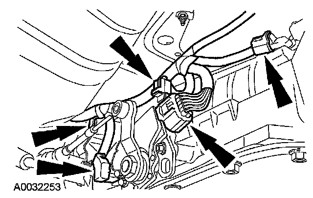 15. Position the transmission wiring and connect the pushpins, the transmission backup light switch, the transmission range sensor, if equipped, and the vehicle speed sensor electrical connectors.