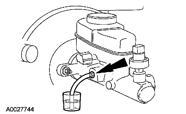 15. Connect one end of a flexible tube to the master cylinder bleeder screw. Submerge the other end in a container partially filled with the specified brake fluid.