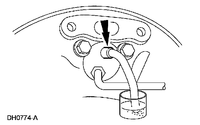 2. Connect a clear drain tube to the RH rear bleeder screw and the other end in a container partially filled with recommended brake fluid.