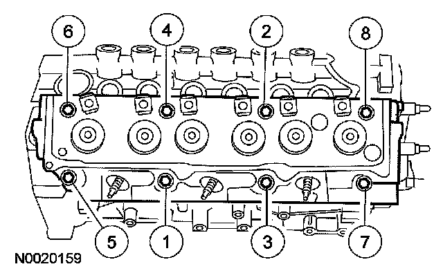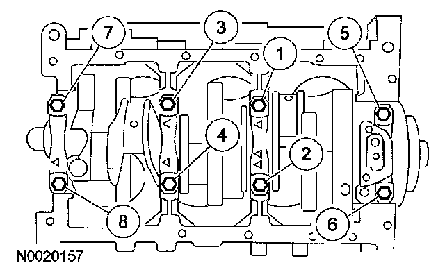 7. Install the 8 main bearing cap bolts in the sequence shown.