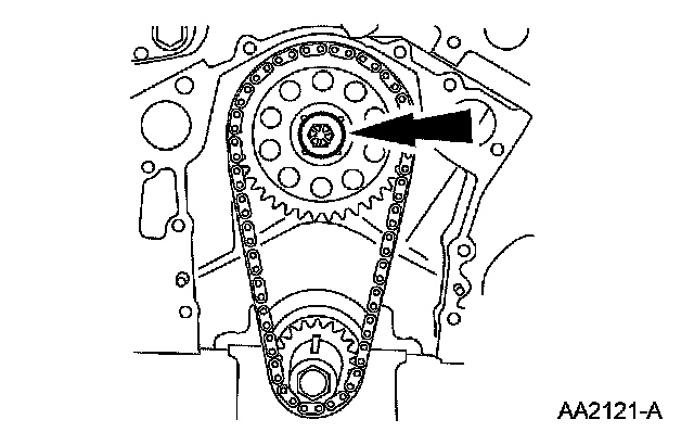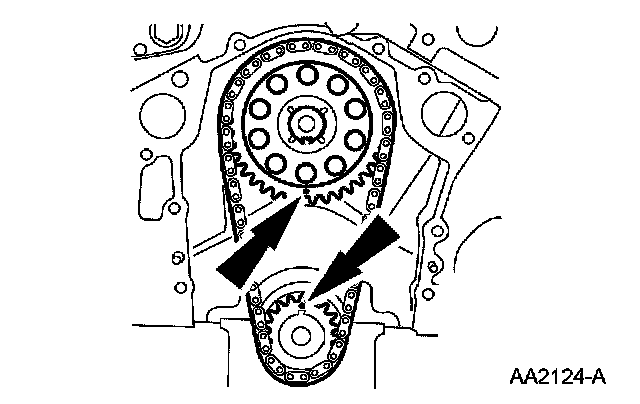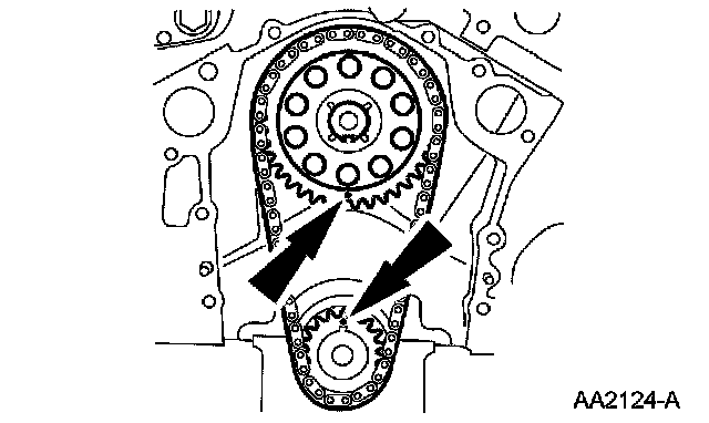 12. Install the timing chain, the camshaft sprocket and the crankshaft sprocket as an assembly with the timing marks aligned.