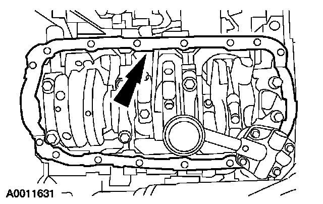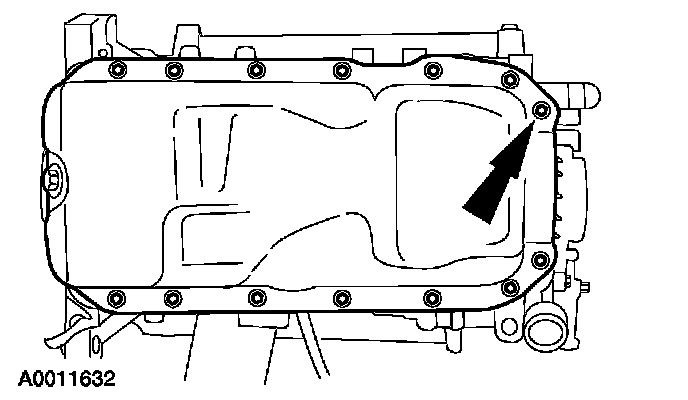 ^ Tighten the oil pan bolts to 12 Nm (9 ft. lbs.) in the sequence shown.